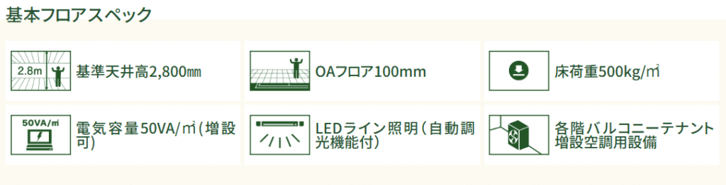 | こだわり条件 | 新築、築浅, 個別空調, バルコニーorテラス有, OAフロア, トイレ男女別, 駐車場有 |